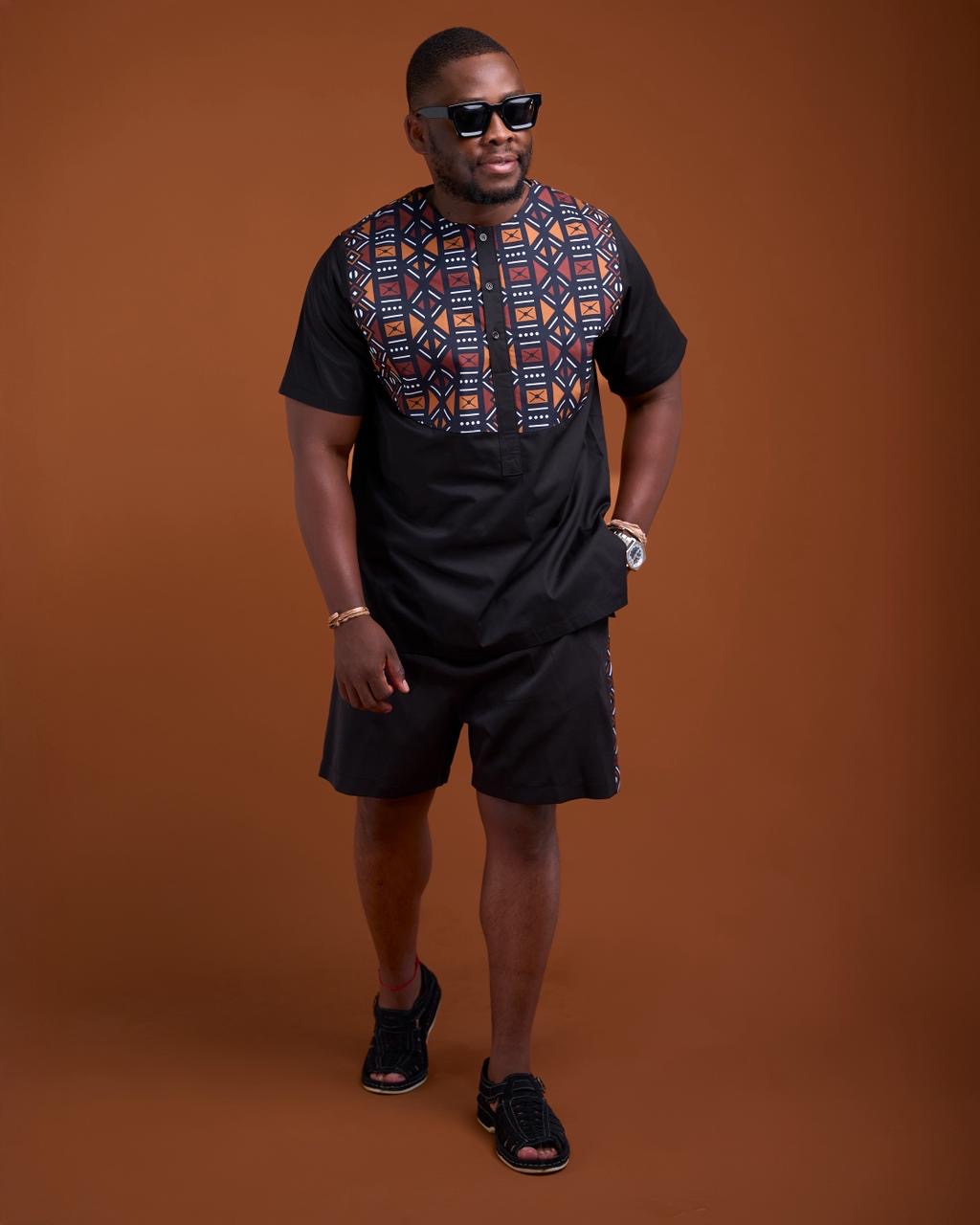 • Men’s shorts in a black chino material with Mudcloth print as a feature on the side seams
